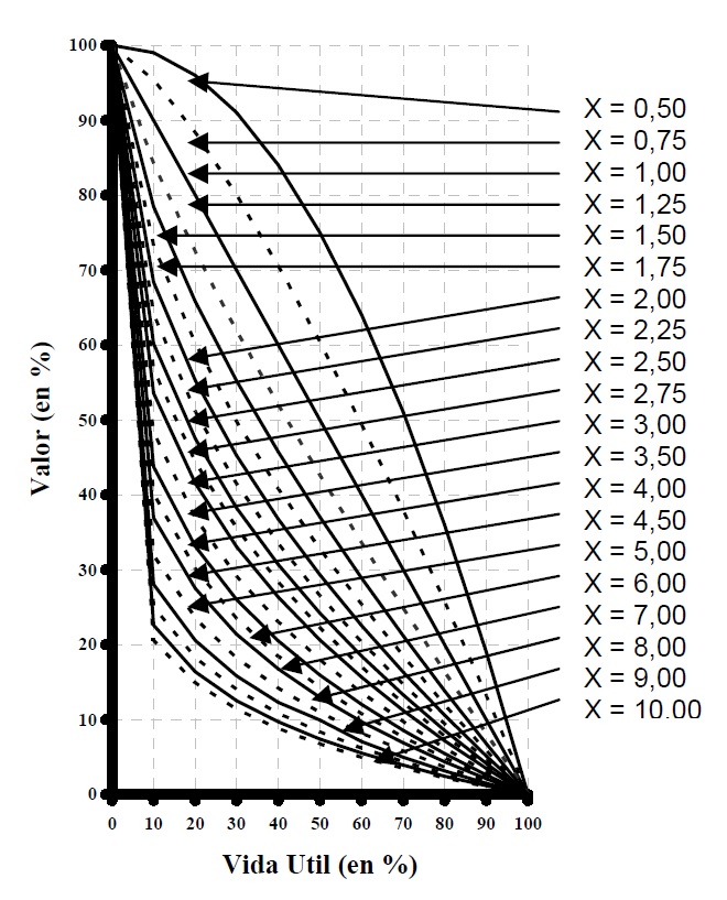 O fator de depreciação atribuído à antiguidade (K1) resulta do quociente entre a antiguidade e a vida útil, elevado a um fator (1/X) que resulta das experiências práticas levadas a cabo por Jans.
