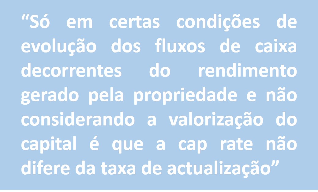 “Só em certas condições de evolução dos fluxos de caixa decorrentes do rendimento gerado pela propriedade e não considerando a valorização do capital é que a cap rate não difere da taxa de actualização (Brueggeman, W. e Fisher, J. , 1997, “Real Estate Finance and Investments”, Irwin McGraw-Hill)”