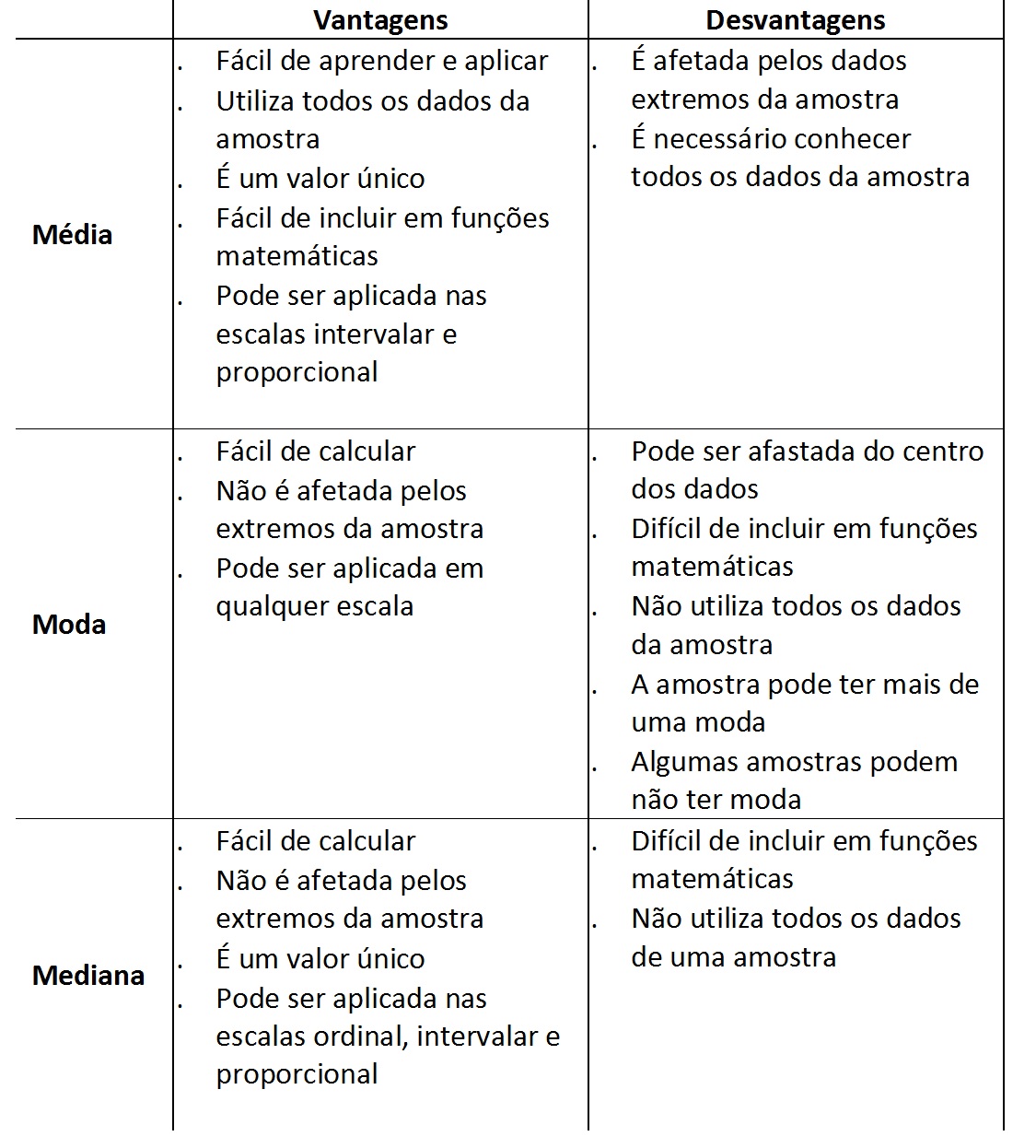 As medidas de tendência central da amostra são a média (a divisão da soma dos valores das observações pela quantidade de observações), moda (o valor mais frequente, ou seja, que mais se repete, na amostra) e mediana (o valor em que acima dele se situa metade dos valores da amostra, de tal forma que a outra metade se encontra abaixo dele).
